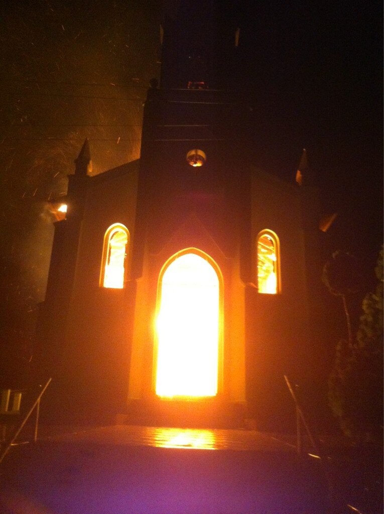 Os bombeiros demoraram mais de duas horas para conter as chamas na noite de segunda (25). O fogo começou por volta de 18h30. “Quando a gente chegou, já estava tudo tomado. O teto já tinha colapsado. A estrutura já estava toda consumida pelas chamas”, disse o tenente Gelanha. Em 30 minutos, o fogo já havia tomado conta da parte interna da igreja. Da edificação, sobraram o sino, a torre e as paredes.