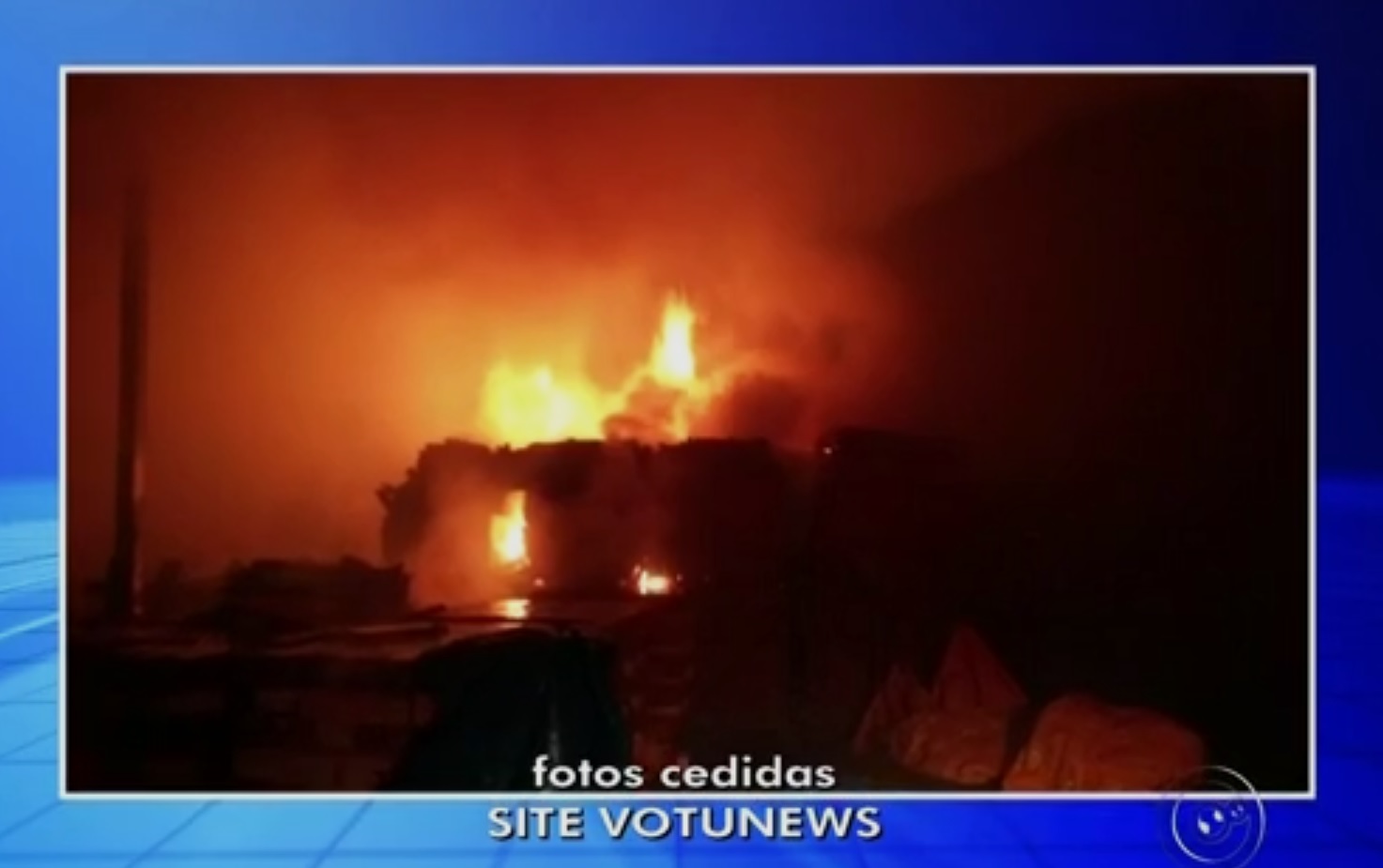 Incêndio destruíu chapas de madeiras armazenadas em galpão (Foto: Reprodução/Site VotuNews)