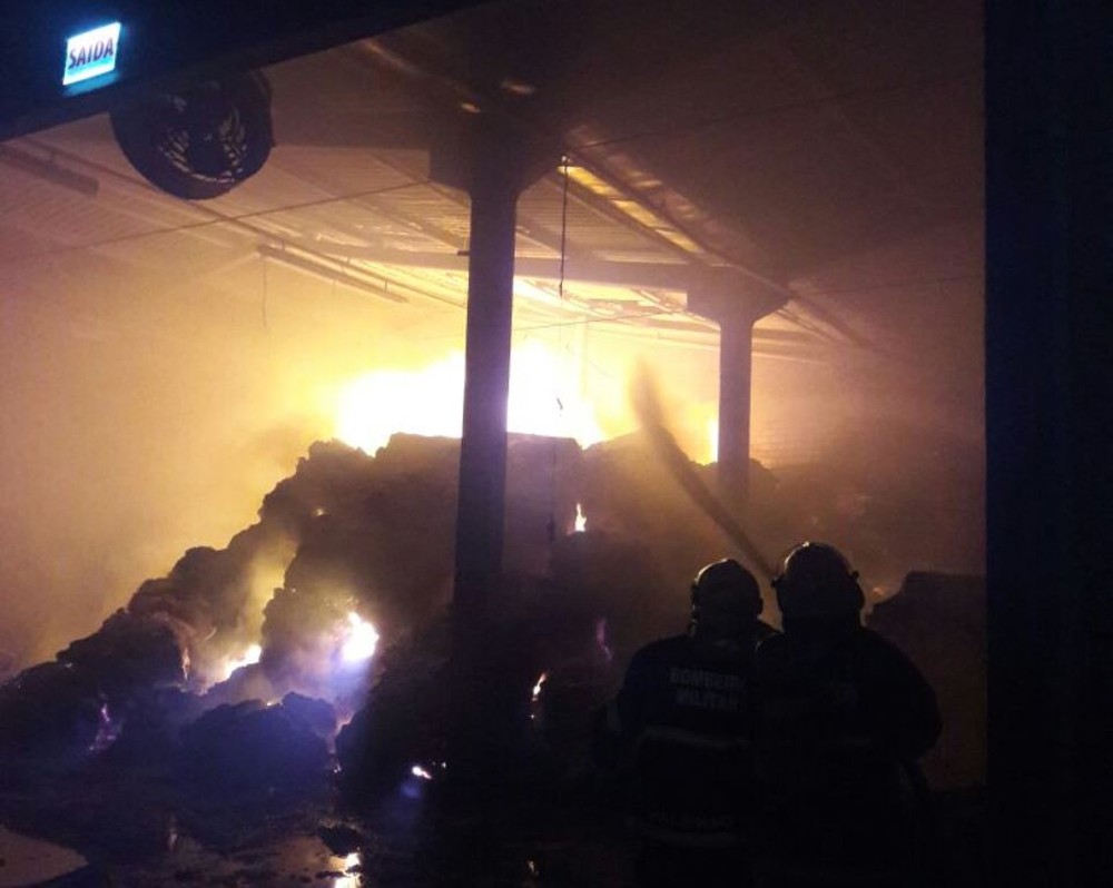 O fogo começou por volta das 20h de quinta-feira (20) e atingiu grandes proporções ao consumir um estoque de algodão da Hantex Resíduos Têxteis Ltda, que fica às margens da BR-470.
