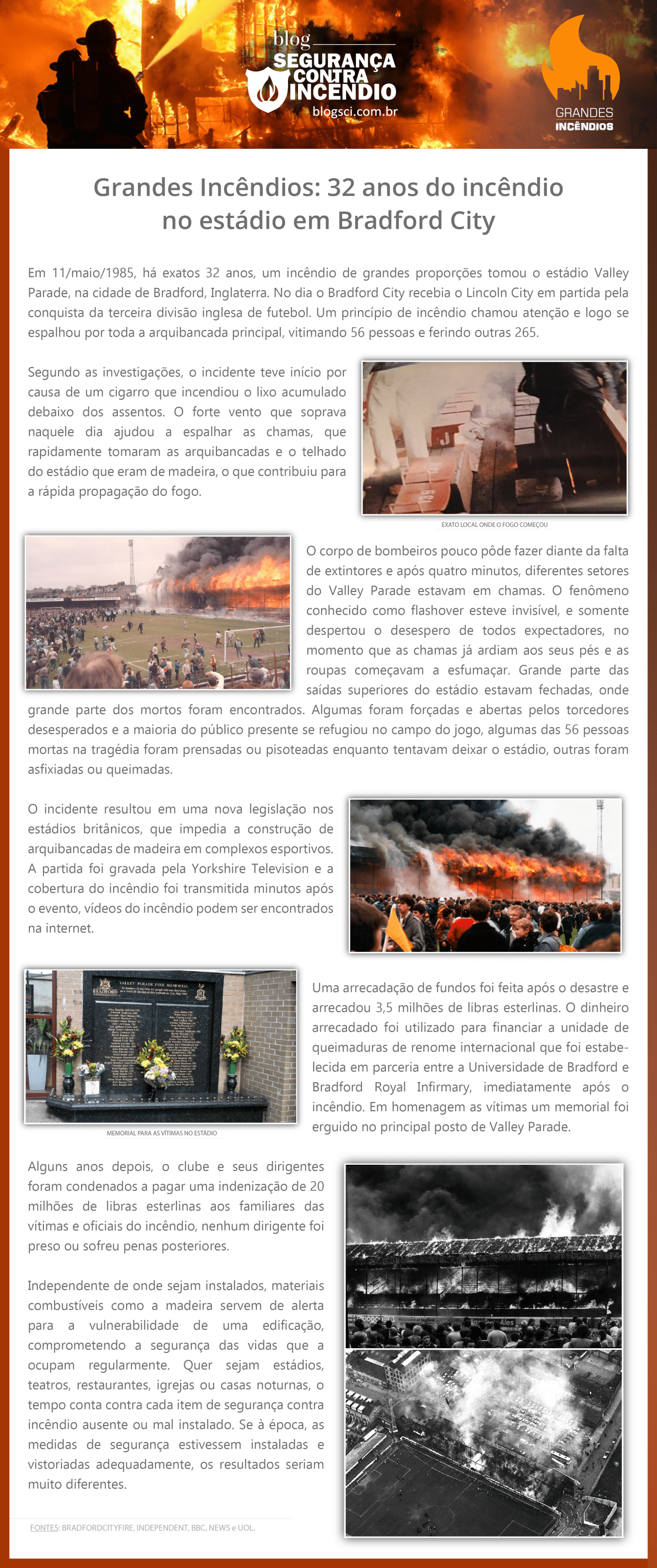 Postado 11 11America/Sao_Paulo maio 11America/Sao_Paulo 2017 por Segurança Contra Incêndio2 comentários em Grandes Incêndios: 32 anos do incêndio no estádio em Bradford City Blog SCI Grandes Incêndios: 32 anos do incêndio no estádio em Bradford City Confira outros Grandes Incêndios: Alemoa, Santos Edifício Andraus Boate The Station Edifício Joelma Boate Kiss Museu da Língua Portuguesa Memorial da América Latina CategoriasBlog SCI, Bradford City, Corpo de Bombeiros, fogo, Grandes Incêndios, incêndio, Incêndios em Estadios, InglaterraTagschamas, Corpo de Bombeiros, destruição, Falta de prevenção, feridos, fogo, incêndio Bradford City, incêndio estádio Valley Parade, incêndio na Inglaterra, vítimasCompartilhe isso: Clique para compartilhar no X(abre em nova janela) 18+ Clique para compartilhar no Facebook(abre em nova janela) Facebook Clique para compartilhar no LinkedIn(abre em nova janela) LinkedIn Clique para enviar um link por e-mail para um amigo(abre em nova janela) E-mail Curtir Carregando... Segurança Contra Incêndio Ver tudo