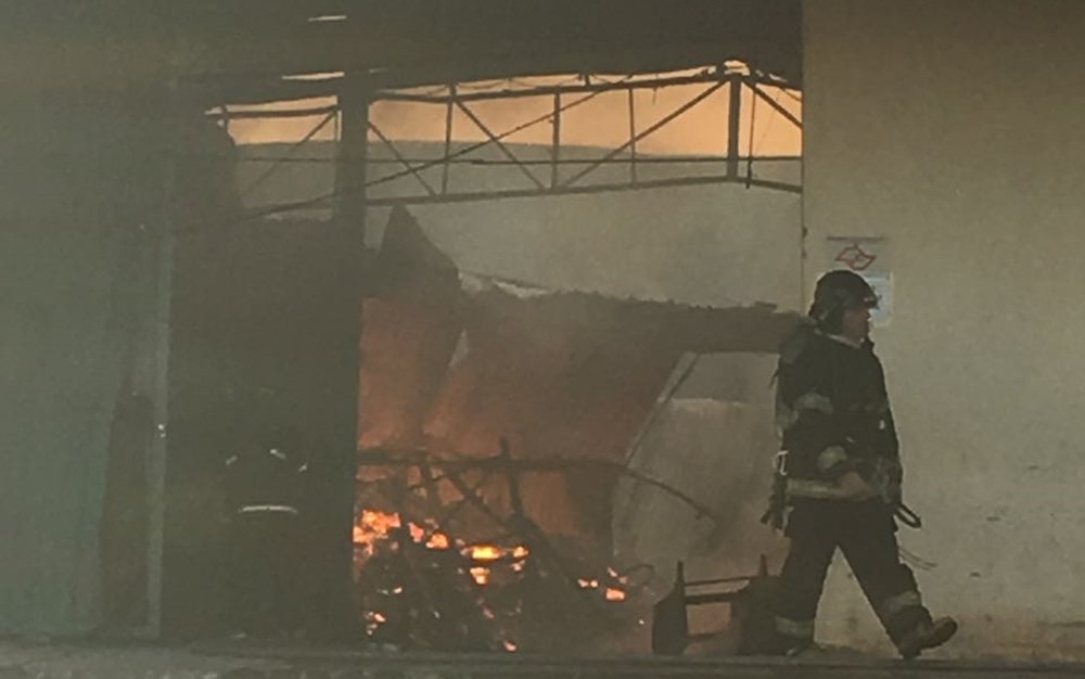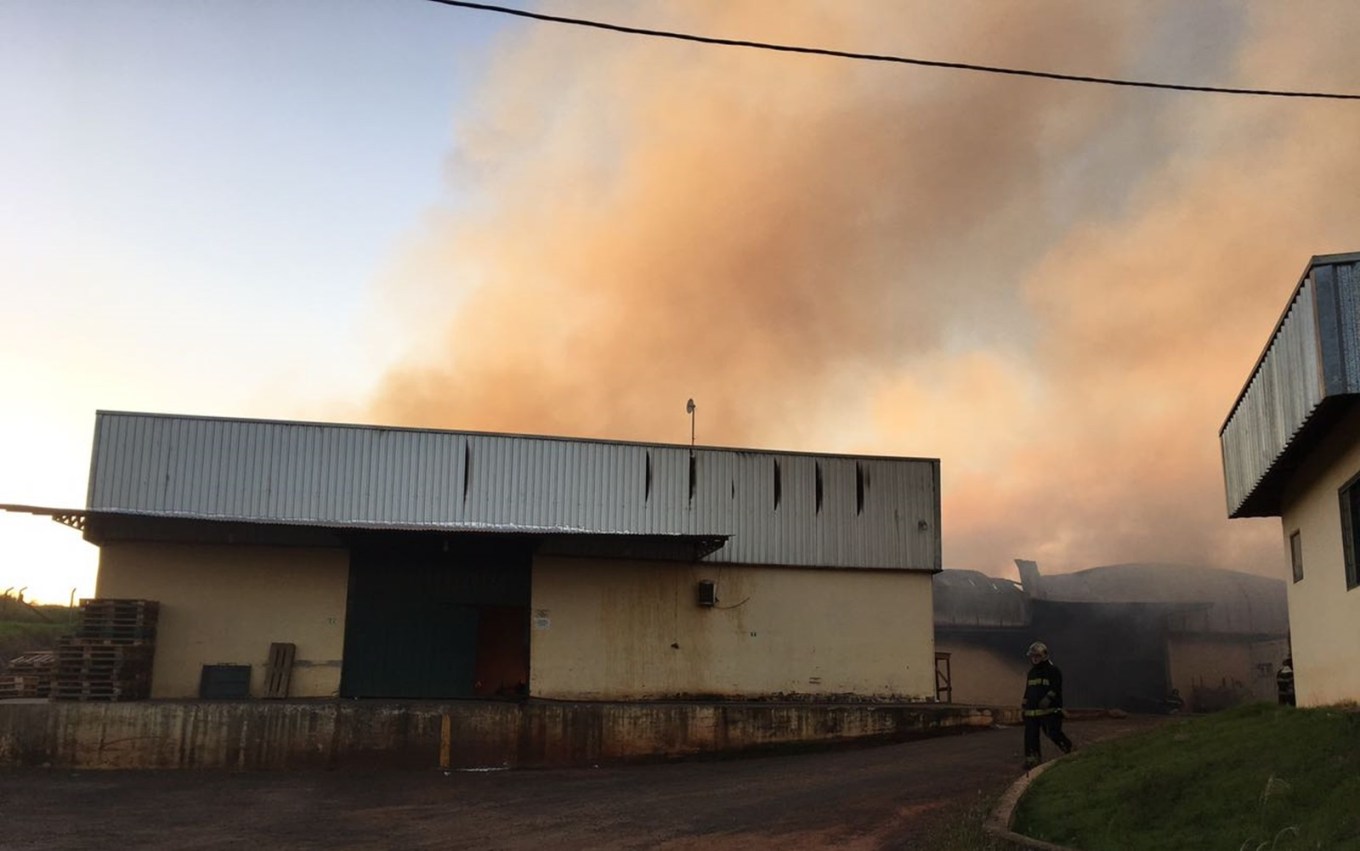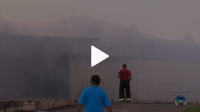 Equipes do Corpo de Bombeiros estão no local e tentam conter as chamas. Uma fumaça se forma na região por conta do incêndio, que atingiu os três barracões da empresa.