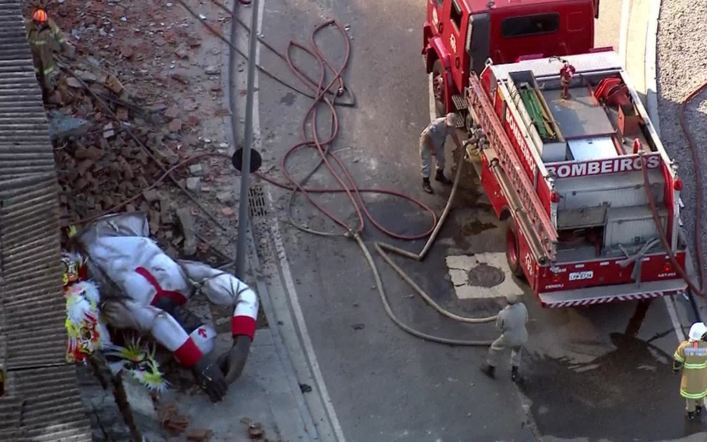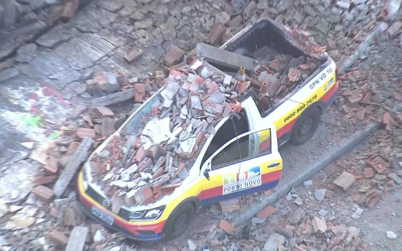 A Concessionária Porto Novo fechou uma das pistas laterais da Avenida Francisco Bicalho, sentido Avenida Brasil. Bombeiros seguem na via. Um dos veículos da empresa foi destruído pelos escombros.