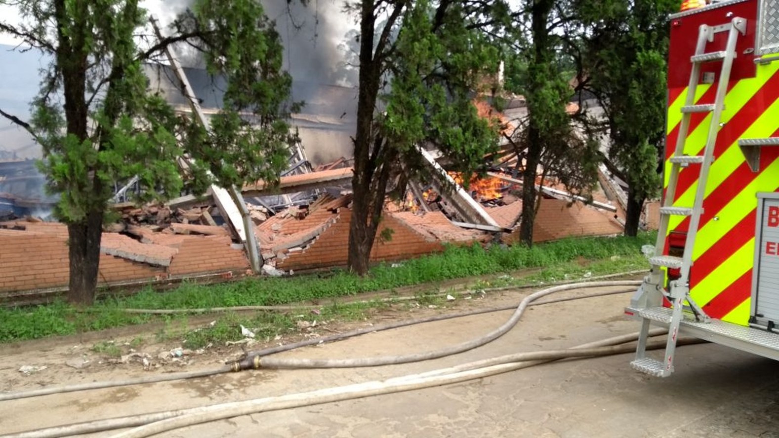 O galpão ficou destruído e a estrutura retorcida. Os Bombeiros trabalharam até a tarde para controlar as chamas e fazer o rescaldo do incêndio.