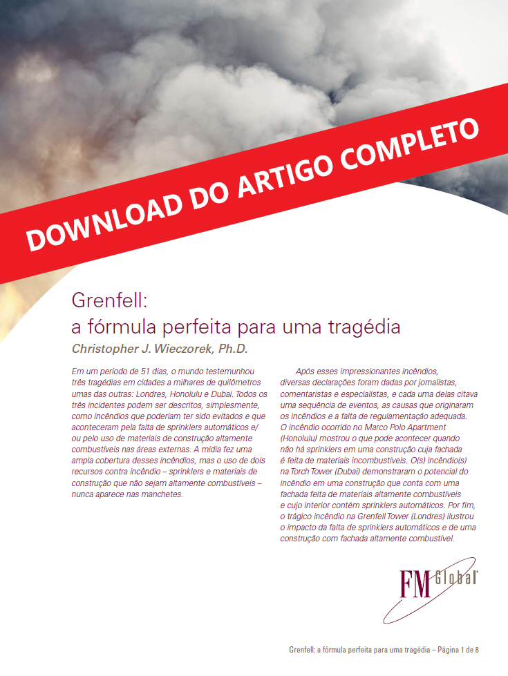 O vice-presidente e gerente de códigos e normas internacionais da FM Global, Christopher J. Wieczorek, acaba de assinar um artigo opinativo sobre a torre Grenfell em Londres e sobre os fatores que impactaram aquela tragédia. O executivo ainda menciona outros episódios recentes, como os ocorridos no Marco Polo Apartment, em Honolulu, e na Torch Tower, em Dubai. Todos os incidentes têm características semelhantes. O texto discute a importância da escolha dos materiais apropriados nas edificações e também dos sistemas de proteção contra incêndio.