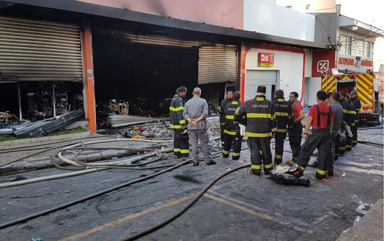 Duas lojas tiveram que ser abertas pelas equipes para que os bombeiros pudessem acessar o local.