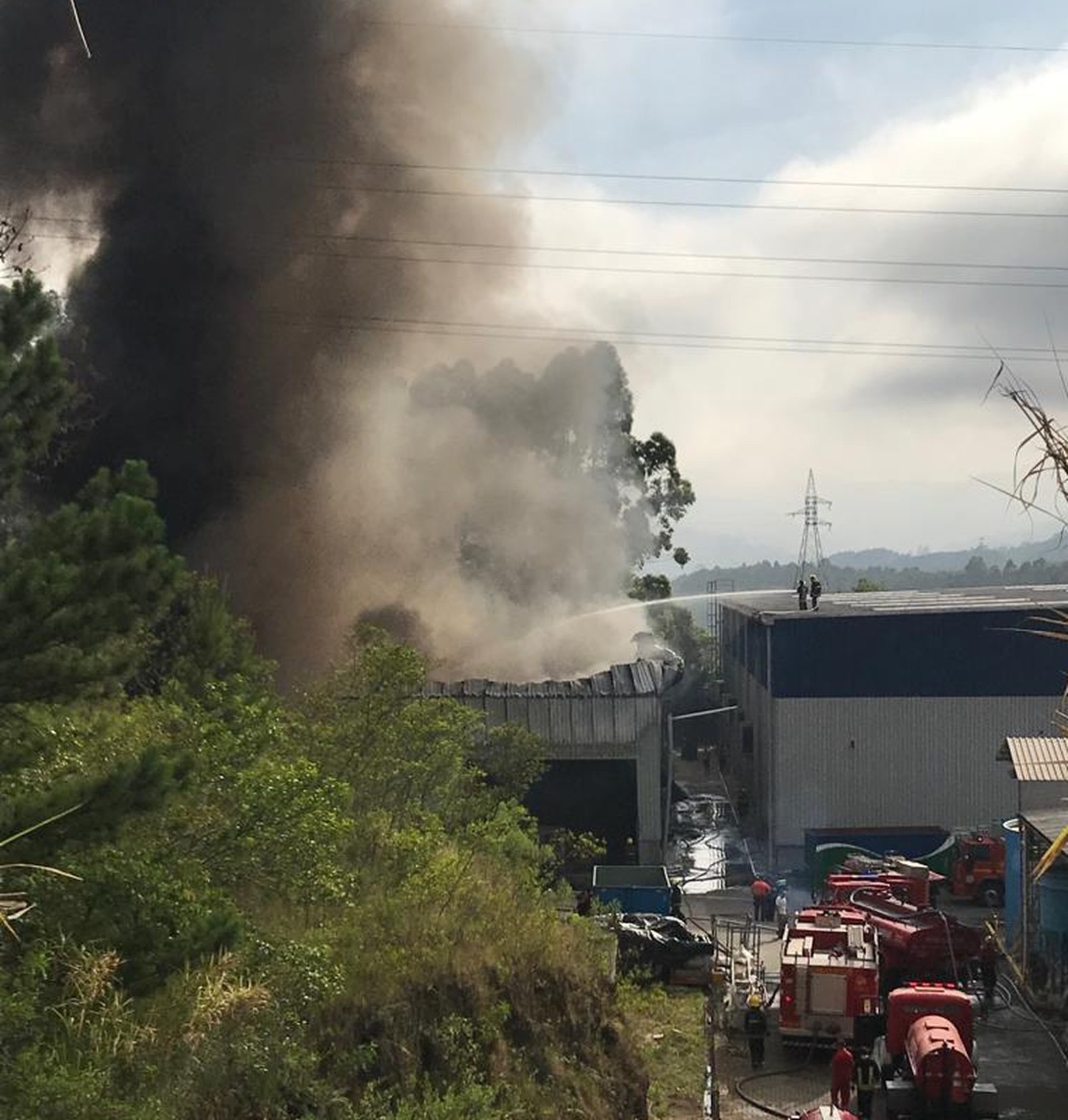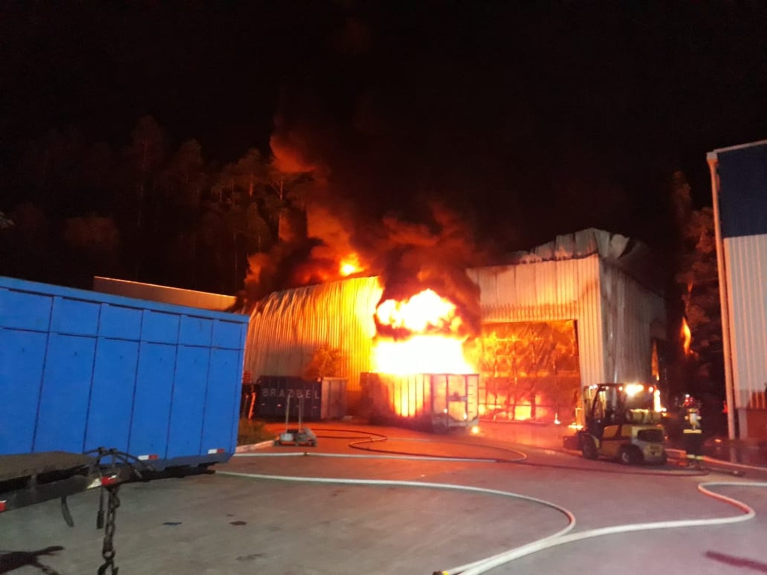Fogo atinge depósito de sucata plástica da empresa Plastiweber desde a madrugada deste domingo (16). Não há informações de feridos.