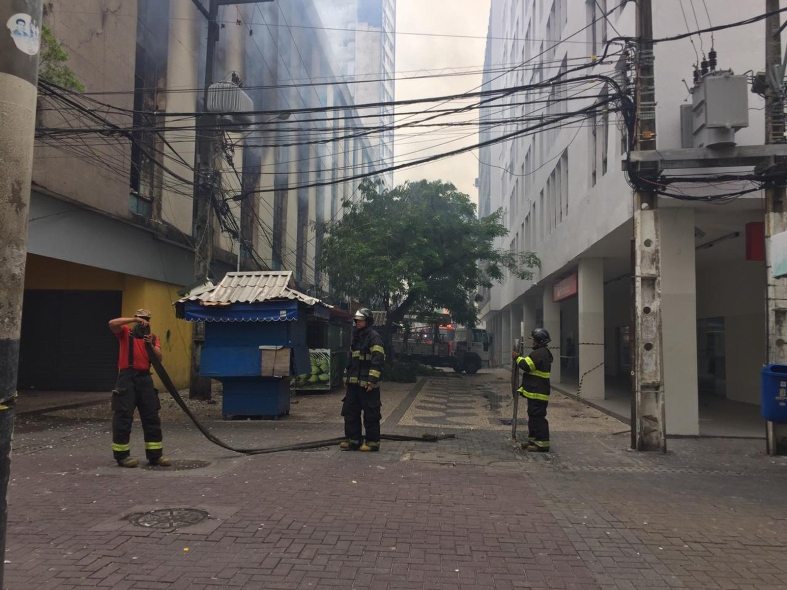 Fogo atingiu um andar do imóvel, no cruzamento das ruas Sete de Setembro e Imperatriz, no bairro da Boa Vista, segundo bombeiros. Rachaduras são vistas na área externa do edifício.