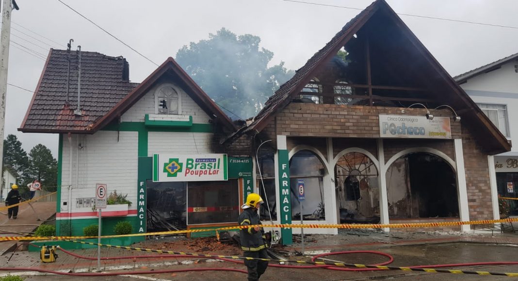 A área foi isolada porque corre o risco de desabar; farmácia e clínica foram totalmente destruídas no fogo.