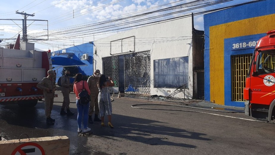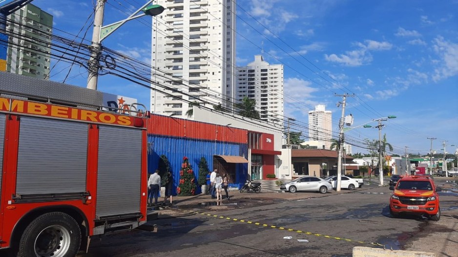Um incêndio destruiu uma loja de revenda de pneus e atingiu também um prédio usado como depósito de mercadorias de decoração de Natal na Avenida Fernando Corrêa da Costa, em Cuiabá.